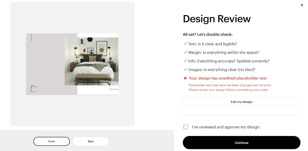 Tick the box to confirm you’ve reviewed and approve of your design and click “Continue.”